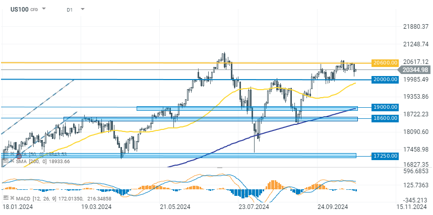 Hoy, los alcistas están intentando recuperar algunas de las pérdidas, y los futuros del Nasdaq-100 subiron un 0,40% en la primera parte del día. La mejora del sentimiento está ciertamente respaldada por los sólidos resultados de Tesla (TSLA.US), que hicieron que las acciones subieran hasta un 12% en las operaciones posteriores al cierre. Desde una perspectiva técnica, la zona de soporte clave para la tendencia bajista actual sigue estando en los 20.000 puntos, mientras que el nivel de resistencia superior está en torno a los 20.600 puntos.