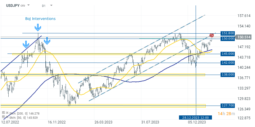 El USDJPY ha vuelto a superar el nivel clave de 150, lo que, a finales de 2022, provocó serias reacciones por parte de los políticos y del Banco de Japón. Aunque no observamos tal reacción ahora, en el gráfico podemos notar pruebas de niveles clave que históricamente iniciaron correcciones. Además, en este momento el USDJPY está probando por debajo del límite inferior de la última tendencia alcista. Esta zona coincide con la zona de resistencia en los niveles 150.000-151.800, y si vemos una reacción bajista más fuerte aquí, podemos esperar una corrección al menos a corto plazo. Por esta razón, vale la pena estar atento al nivel de 151.800 como punto crítico para la continuación del movimiento alcista y al nivel de 145.000 como rango potencial para una posible corrección.