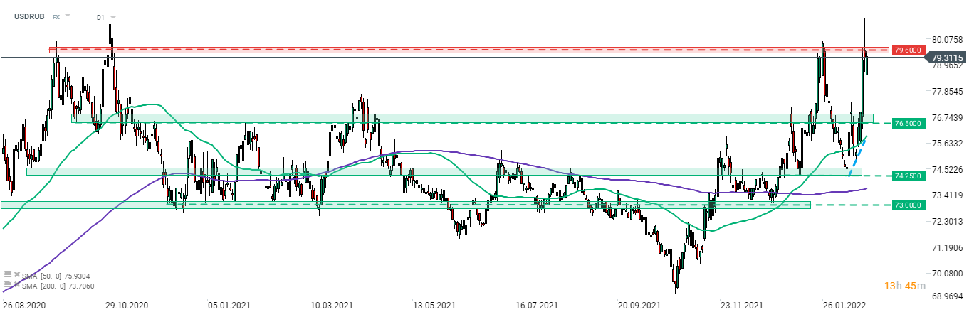 Las acciones rusas y los rublos se están viendo afectados. USDRUB saltó ayer por encima de 80.00 por primera vez desde noviembre de 2020. El par retrocedió por debajo de este obstáculo más tarde y, como resultado, pintó un doble techo en el área de 79.60. Los bajistas intentaron empujar al par a la baja hoy, pero se resumió un movimiento alcista después del lanzamiento de la sesión europea. La situación fundamental y el sentimiento general no favorecen al rublo ruso y, por lo tanto, no se puede descartar otro intento de romper por encima de 80.00.