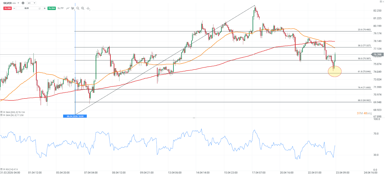 La plata ha corregido desde los máximos cercanos a 82 dólares la onza, en un movimiento que refleja el reposicionamiento del mercado tras el giro en el frente geopolítico y la rotación de flujos que se observó mientras las negociaciones con Irán avanzaban. El reciente repunte del dólar y el alza en los rendimientos reales del Tesoro han añadido presión adicional al metal, que históricamente muestra alta sensibilidad a ambos factores. A nivel técnico, el precio ha encontrado soporte en la zona de 73,846, nivel que coincide con el retroceso del 61,8% de Fibonacci del tramo alcista iniciado el 6 de abril. El rebote desde esta zona ha devuelto al precio a la región de 76,398, por debajo del retroceso del 38,2% ubicado en 77,327, que pasa a ser la primera resistencia de corto plazo. La media móvil de 50 periodos en 78,134 y la zona del 23,6% de Fibonacci en 79,480 definen la siguiente franja de resistencia técnica. Por el lado inferior, la pérdida del soporte en 73,846 abriría espacio hacia el 76,4% de Fibonacci en 71,693. El RSI en 47,9 refleja la pérdida de momentum sin entrar en territorio de sobreventa.