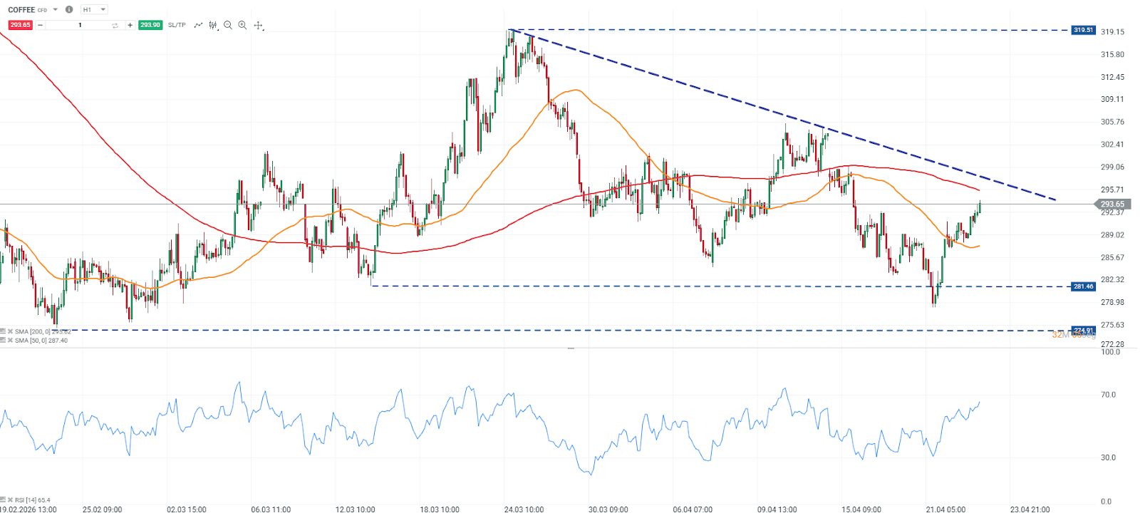 El café arábica registró el mayor avance en dos semanas en Nueva York, apoyado en la preocupación por la persistencia de costes logísticos elevados mientras el estrecho de Ormuz siga sin operar con normalidad. Aunque la extensión del alto el fuego reduce el riesgo inmediato de un nuevo escalamiento, el mercado aún no tiene señales concretas sobre la reapertura del corredor energético, lo que mantiene la presión sobre los fletes y amplifica el impacto del conflicto en una serie de productos agrícolas, particularmente en aquellos con reservas certificadas ya ajustadas. En el caso del arábica y el robusta, los inventarios se encuentran en niveles bajos, lo que convierte al mercado en especialmente vulnerable a cualquier disrupción en la cadena logística. Desde el punto de vista técnico, el precio rebotó aproximadamente un 5% desde la zona de soporte relevante en 281,46, movimiento que ha devuelto la cotización por encima de su media móvil de 50 periodos, ubicada en 287,40, en lo que constituye una primera señal de recuperación técnica. El precio se aproxima ahora a la directriz bajista trazada desde los máximos del 24 de marzo, referencia que el mercado deberá superar para consolidar un cambio de inercia. Por encima de esa resistencia dinámica, el punto pivote de mayor relevancia se ubica en la región de 319,51, zona que marca el máximo reciente. El RSI en 65,4 refleja la fortaleza del impulso actual sin entrar todavía en zona de sobrecompra.