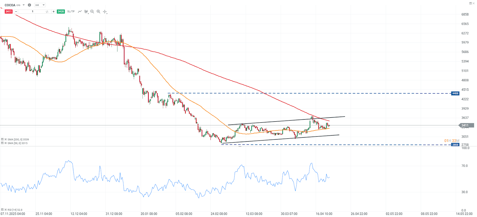 El cacao cotiza en una fase de estabilización tras el severo ajuste desde los máximos de finales de 2024. Costa de Marfil, el mayor productor mundial, está evaluando implementar revisiones trimestrales del precio interno al productor, sustituyendo el esquema actual de dos ajustes anuales del Conseil du Café-Cacao. El cambio busca alinear con mayor agilidad el precio doméstico a la caída en el mercado internacional, en un contexto en que el mercado global ha transitado desde un déficit estructural hacia un escenario de mayor holgura en la oferta, con proyecciones que apuntan a un superávit en la próxima cosecha. Desde el punto de vista técnico, el precio ha encontrado suelo en la zona de 2.808 y ha construido una estructura correctiva ordenada dentro de un canal equidistante alcista. La cotización se aproxima actualmente a la media móvil de 200 periodos en gráfico de 4 horas, ubicada en 3.539, una referencia clave para validar la continuidad del impulso correctivo al alza. Por encima, el punto pivote de mayor relevancia se encuentra en 4.408, nivel que definiría un cambio estructural más significativo en caso de ser alcanzado y superado. El RSI en 53,1 se mantiene en zona neutral, consistente con la fase de consolidación que atraviesa el activo.
