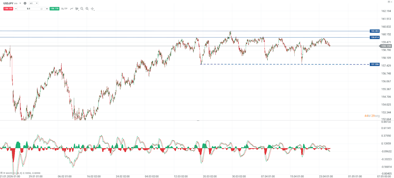 El USDJPY es uno de los pares más seguidos por el mercado dada su condición de divisa principal en las operaciones de carry trade, sensible a cualquier cambio en el diferencial de tasas entre la Reserva Federal y el Banco de Japón. En la sesión nocturna, el BoJ entregará su decisión de tasas, en una reunión donde el consenso anticipa que la entidad mantendrá su tasa de referencia sin cambios. El foco estará en los comentarios del gobernador Ueda durante la conferencia de prensa y en el Outlook Report trimestral, documento que actualiza las proyecciones de crecimiento e inflación y que el mercado utilizará para recalibrar la trayectoria esperada del ciclo de normalización. Cualquier ajuste al alza en las proyecciones de inflación o señales que sugieran una posición menos paciente respecto al próximo movimiento podrían impulsar al yen y presionar al par a la baja. A nivel técnico, el USDJPY cotiza en 159,179 dentro de un rango de consolidación bien definido. La zona de 159,914 actúa como primera resistencia, seguida por el techo del rango en 160,464, nivel que de ser superado abriría espacio para una extensión del movimiento al alza. Por el lado inferior, el soporte inmediato se ubica en 157,769, con una referencia adicional en 157,556, zona donde una pérdida confirmada implicaría un cambio estructural más relevante en la tendencia de corto plazo. El MACD se mantiene plano cerca de la línea cero.
