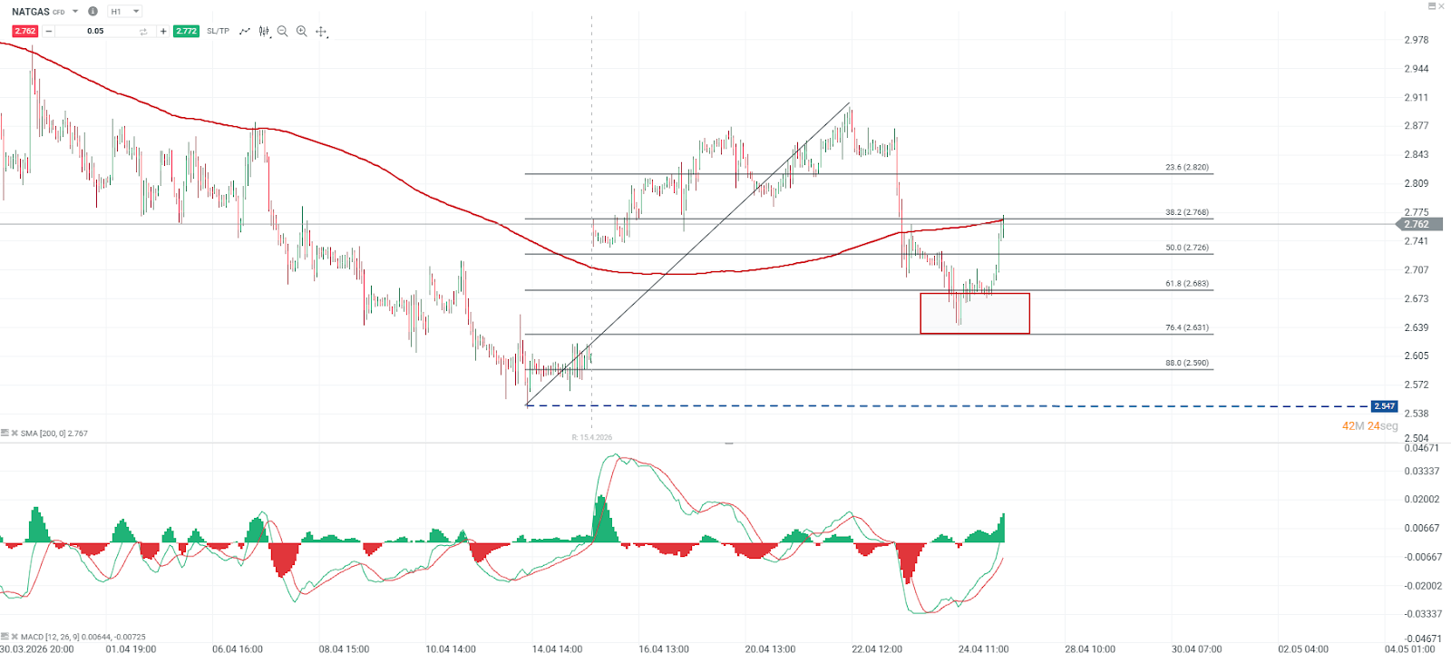 El gas natural mantiene un impulso constructivo apoyado en la dinámica global de oferta. Vietnam ha aumentado de forma significativa sus importaciones de GNL a precios elevados, en un contexto en el que el conflicto con Irán reduce los suministros mundiales y el país se prepara para temperaturas superiores a la media en las próximas semanas. Según datos de seguimiento de buques recopilados por Bloomberg, Vietnam ha importado cerca de 276.000 toneladas de GNL en lo que va del mes, cifra que ya constituye un récord mensual y supera en más del doble lo registrado en el mismo periodo del año anterior. Este incremento se inscribe en una tendencia más amplia de tensión en el mercado de GNL asiático, donde el redireccionamiento de flujos derivado de la disrupción en Ormuz ha presionado al alza la prima por suministro spot. A nivel técnico, el precio ha respetado la zona de retroceso entre el 61,8% y el 76,4% de Fibonacci del impulso iniciado el 14 de abril, comprendida entre 2,683 y 2,631, donde construyó una estructura de giro apoyada en la convergencia con niveles previos. El rebote desde esta franja ha llevado al precio a 2,752, donde la media móvil de 200 periodos en 2,767 actúa como resistencia inmediata y referencia clave para validar la continuidad de la estructura de giro al alza. Por encima, el retroceso del 38,2% en 2,768 y el del 23,6% en 2,820 definen los siguientes niveles de control. El MACD muestra un cruce alcista incipiente, consistente con el rebote en curso, aunque aún requiere confirmación por encima de la media de 200 horaria para consolidar el cambio de inercia.