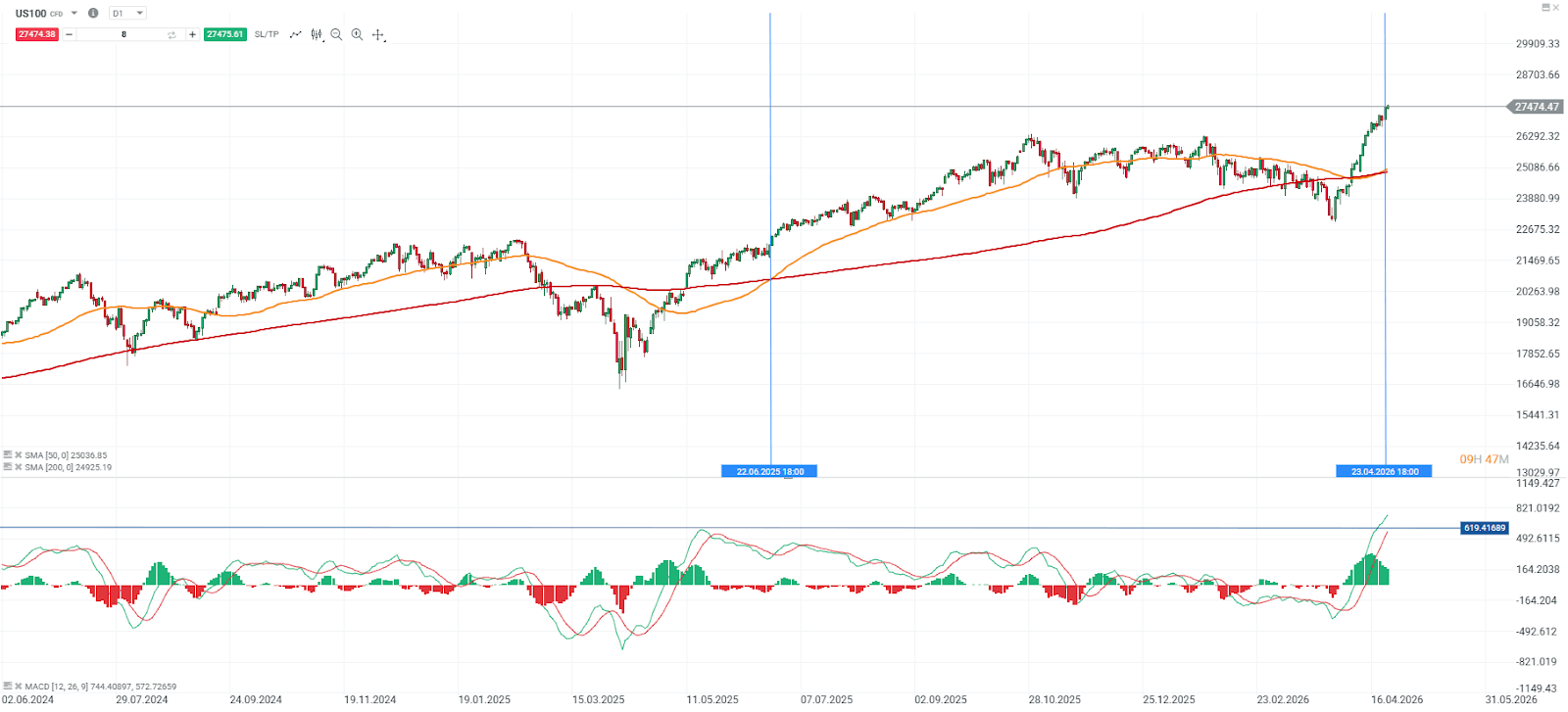 El US100 se ve beneficiado por una combinación de factores particularmente potente para el segmento tecnológico. Por un lado, la compresión de la prima de riesgo geopolítica tras la propuesta iraní libera capacidad para que los flujos vuelvan a rotar hacia activos de mayor duración. Por otro, el liderazgo del sector semiconductores en Asia, con TSMC marcando nuevos máximos históricos, refuerza la narrativa de fortaleza estructural en la cadena de valor de la IA y mejora el sentimiento general hacia el complejo tecnológico global. A esto se suma el catalizador clave de la semana, la entrega de resultados de Microsoft, Meta, Apple, Alphabet y Amazon, compañías que en conjunto representan una proporción significativa de la capitalización del índice y cuyos números actuarán como prueba para validar los múltiplos actuales. Desde el punto de vista técnico, el precio ha consolidado nuevos máximos por encima de los 27.000 puntos, con el MACD superando la resistencia previa marcada por los máximos del impulso anterior. A esto se suma el cruce alcista de la media móvil simple de 50 días sobre la de 200 días, configuración técnica conocida como cruce dorado, que se observó por última vez el 22 de junio de 2025, cuando el índice acumuló posteriormente un avance superior al 20%. La media de 50 periodos en 25.036 y la de 200 en 24.925 definen ahora la zona de soporte estructural más relevante para la continuidad del impulso.