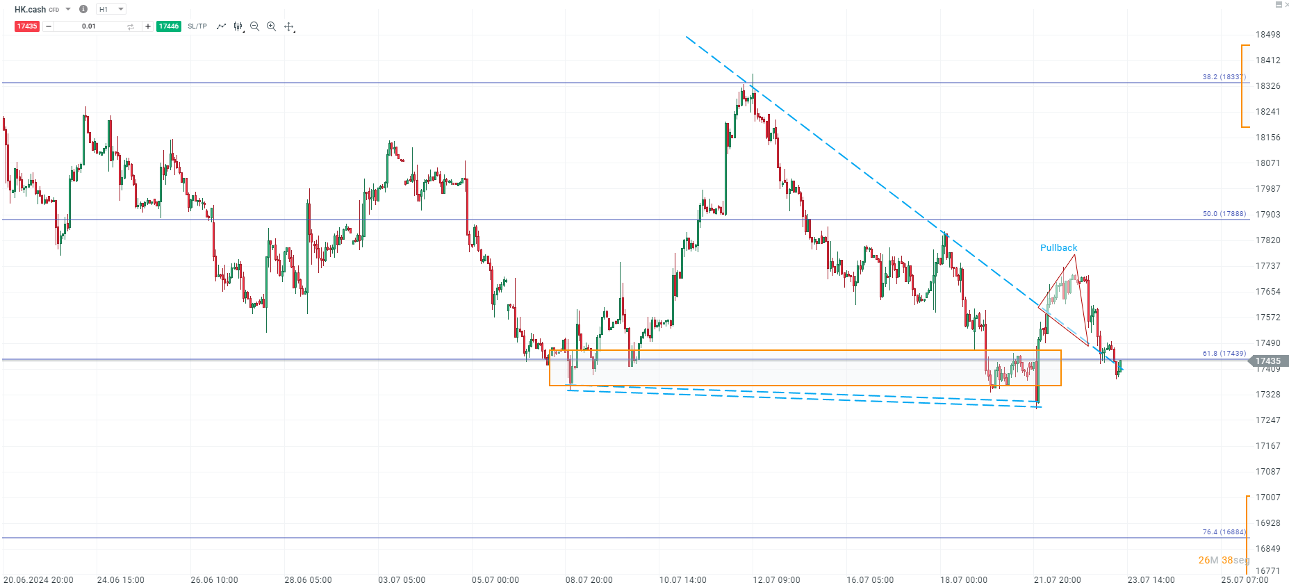 El precio de HK.Cash está realizando el pullback anticipado desde la sesión de ayer. Este movimiento se produce tras señales de ruptura de la directriz superior de un triángulo descendente. Sin embargo, la amplitud de la ruptura no logró romper la secuencia de mínimos decrecientes, llevando a los inversores a adoptar una postura defensiva y considerar un posible retroceso modelo Pullback.