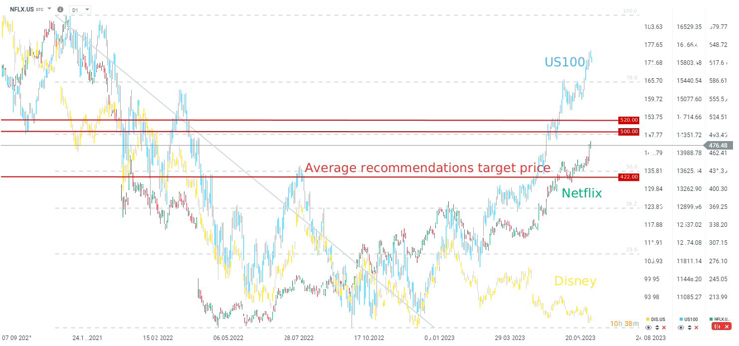 En el transcurso del año, Netflix no tuvo igual en términos de crecimiento del precio de las acciones. Sin embargo, todavía está un 50% por debajo de sus máximos históricos. Fuente: Bloomberg, XTB.