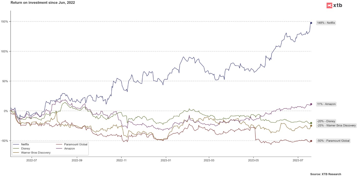 La empresa presentó un resultado neto muy sólido, ya que el beneficio por acción fue de 3,29 $, frente a los 2,86 $ esperados. Además, se esperaba una importante caída interanual desde 3,2 $ por acción, pero gracias a la mejora de márgenes se consiguió un buen resultado económico del que otras plataformas de streaming quisieran presumir. Por otro lado, los ingresos fueron recibidos negativamente por el mercado: ascendieron a 8.200 $ millones, lo que significó un aumento interanual del 3%, mientras que se esperaba un aumento del 4-5%. Sin embargo, lo que es más importante desde la perspectiva de los inversores, la propia empresa dijo que espera un fuerte crecimiento de los ingresos en la segunda mitad del año, pero un resultado potencial de 8.500 $ millones para el tercer trimestre es un objetivo inferior a lo que el mercado ve en 8.700 $ millones. De ahí las caídas del 8% en las cotizaciones posteriores a la sesión tras la publicación del informe financiero. Al mismo tiempo, vale la pena señalar que las acciones recientemente han obtenido fuertes ganancias, por lo que esto puede ser simplemente una realización de beneficios, aprovechando la alta liquidez.