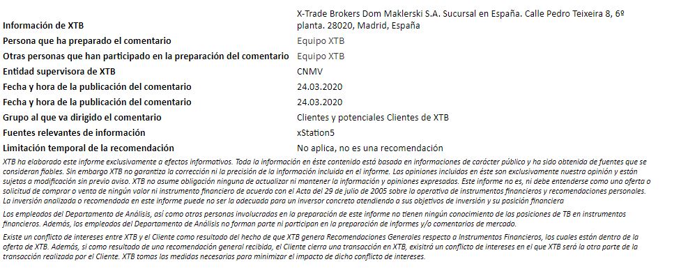 "Este informe se proporciona sólo con fines de información general y con fines educativos. Cualquier opinión, análisis, precio u otro contenido no constituyen asesoramiento de inversión o recomendación en entendimiento de la ley de Belice. El rendimiento en el pasado no indica necesariamente los resultados futuros, y cualquier persona que actúe sobre esta información lo hace bajo su propio riesgo. XTB no aceptará responsabilidad por ninguna pérdida o daño, incluida, sin limitación, cualquier pérdida de beneficio, que pueda surgir directa o indirectamente del uso o la confianza de dicha información. Los contratos por diferencias (""CFDs"") son productos con apalancamiento y acarrean un alto nivel de riesgo. Asegúrese de comprender los riesgos asociados. "