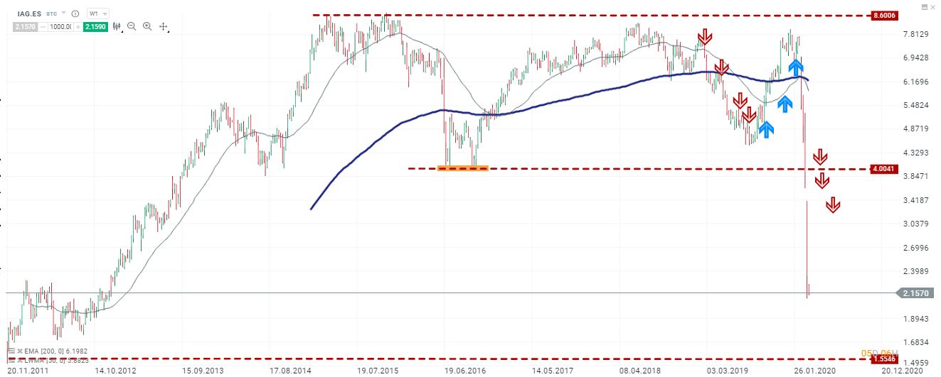 A nivel técnico el desempeño de la cotización de IAG en estos dias ha sido bajsita mas aun al romper el soprote entorno a los 4€, lo cual supone intentar el apoyo en el proximo soporte entorno a los 1.55€.