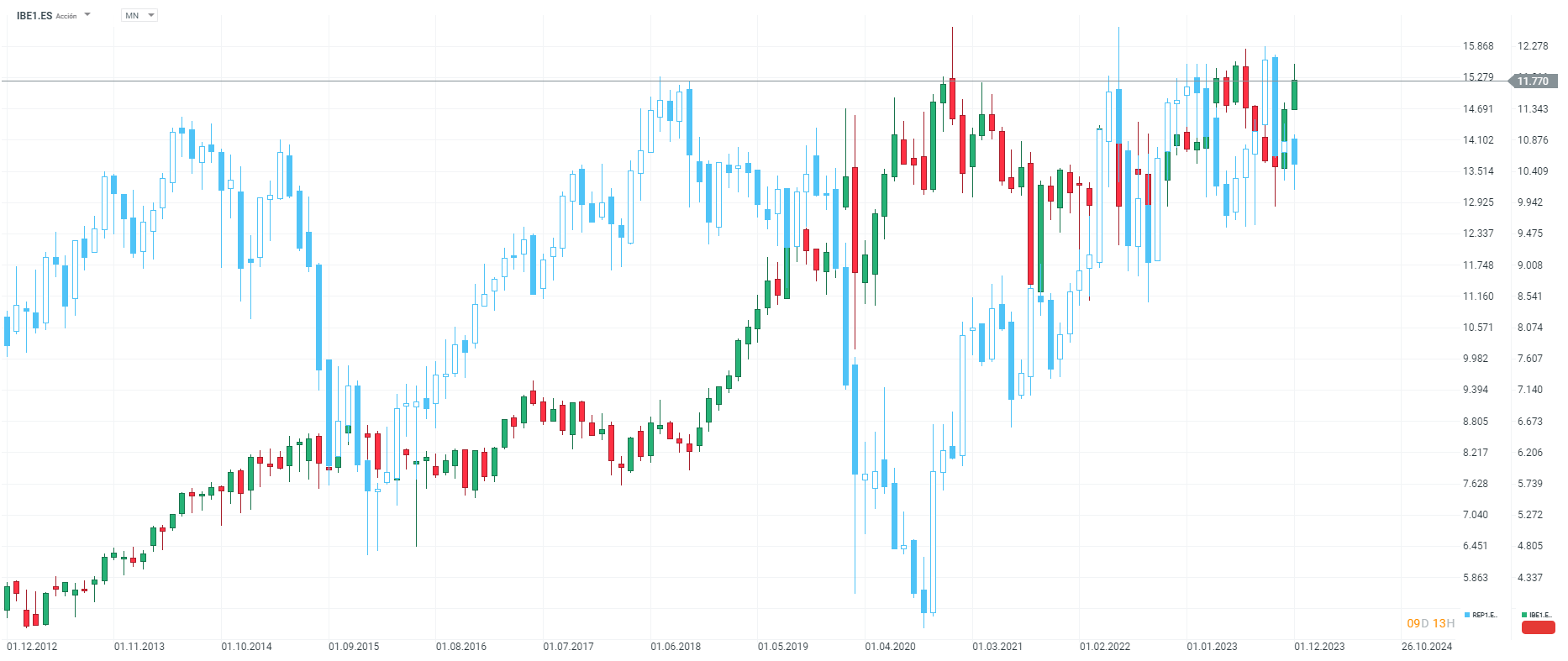 Las velas azules y blancas representan la cotización de Repsol, mientras que las verdes y rojas la de Iberdrola. Fuente: xStation5.