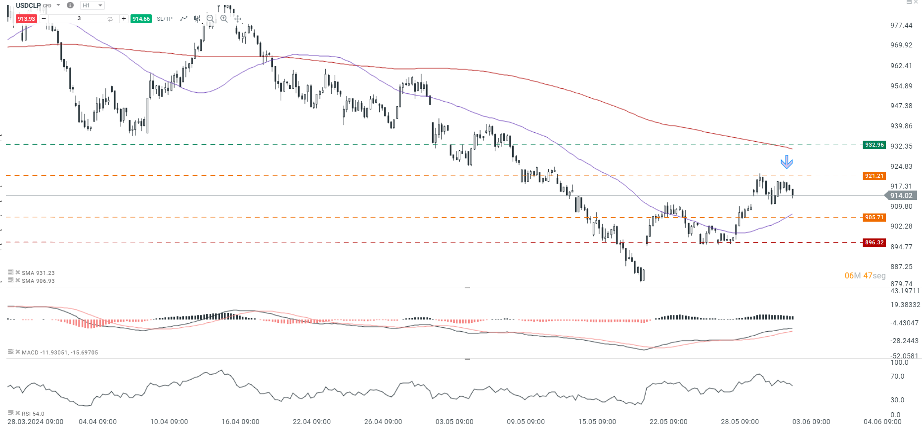 Tras la publicacion del IMACEC, se logra observar que el tipo de cambio intenta terminar con la secuencia de maximos crecientes, continuando con el perfil bajista en el inicio de la semana. Actualmente cotiza en 913.93, mostrando una tendencia bajista al estar por debajo de las medias móviles de 100 y 200 periodos (906.93 y 931.23 respectivamente). El precio está enfrentando resistencia en 921.21 y soporte en 905.71. El RSI se sitúa en 54.0, indicando una posible consolidación, mientras que el MACD está en terreno negativo pero mostrando una leve recuperación.