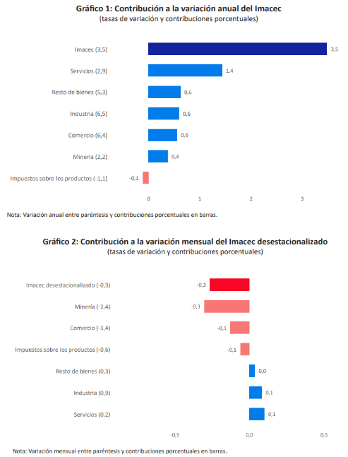 Todas las actividades contribuyeron al crecimiento anual del Imacec, destacando el desempeño de los servicios. En tanto, la disminución del Imacec en términos desestacionalizados se explicó por el resultado de la minería y el comercio.