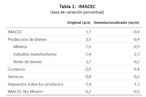 El resultado del Imacec se explicó por el crecimiento de la minería y, en menor medida, por los servicios y el resto de bienes. En tanto, la disminución del Imacec en términos desestacionalizados fue influenciada por el resultado de la industria y los servicios.