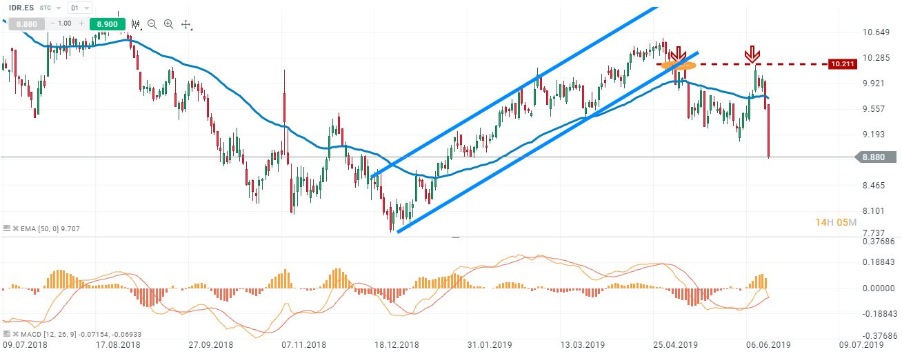 A nivel técnico se observa como INDRA tras alcanzar la zona de resistencia entorno a los 10,21€ forma un doble techo con proyección bajista que con la apertura de las últimas sesiones confirman el escenario bajista, superando incluso el mínimo anterior en los 9,20€.