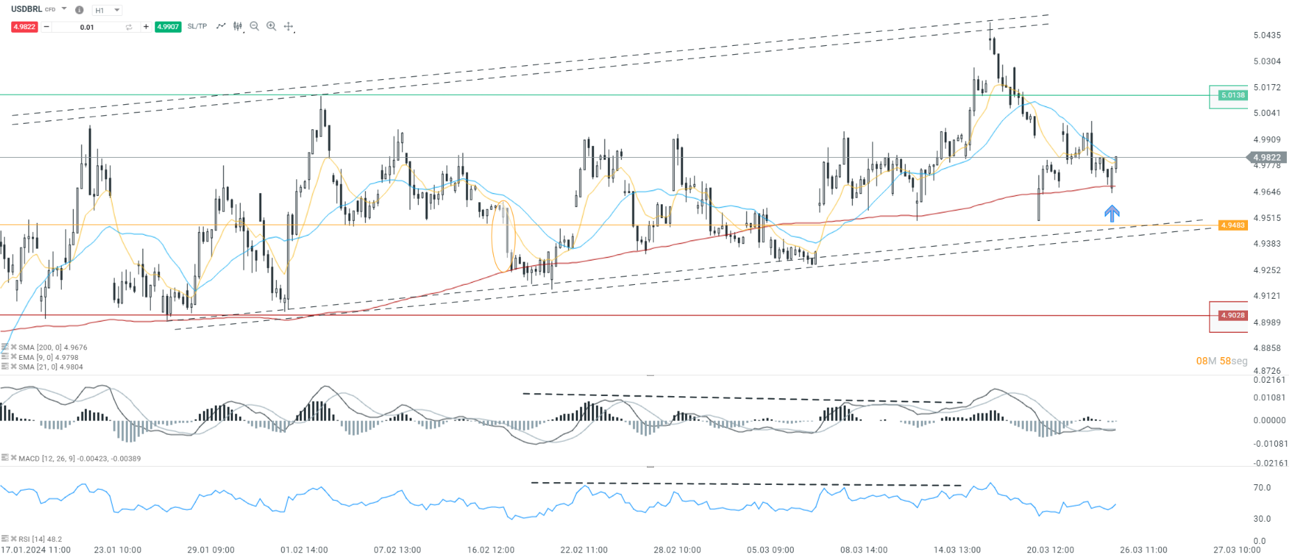 El par de divisas dólar estadounidense frente al real brasileño (USDBRL) está experimentando una corrección tras un fuerte movimiento ascendente que lo llevó a tocar un máximo de 5.0502. Actualmente, el tipo de cambio se sitúa en 4.9822. El nivel clave a tener en cuenta en esta corrección es de 4.9483. Adicionalmente, los osciladores técnicos muestran leves signos de contracción a la baja, lo que sugiere que podría haber una continuación de la tendencia correctiva en el corto plazo.