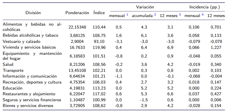 El desglose mostró avances en alimentos y bebidas no alcohólicas y alzas puntuales por producto (por ejemplo, carne de vacuno +4,8%, gastos comunes +4,3%, vino +3,4%), compensados por retrocesos en vestuario y calzado (-3,1%), información y comunicaciones (-1,1%), además de caídas en pan (-2,0%), transporte privado de pasajeros (-6,8%) y equipos de telefonía móvil (-3,3%). Fuente: Instituto Nacional de Estadísticas (INE).