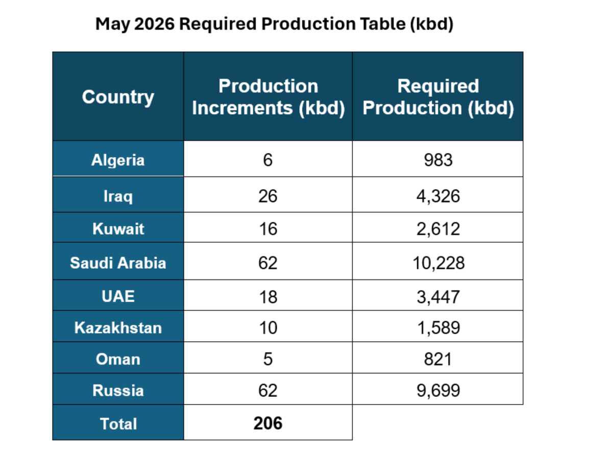 OPEP+ acordó durante una reunión del fin de semana aumentar la producción en 206.000 barriles diarios en mayo en el momento en que se abra el estrecho de Ormuz. Es importante destacar que Rusia también tiene grandes problemas para aumentar producción y exportaciones, debido a los ataques ucranianos contra su infraestructura petrolera.