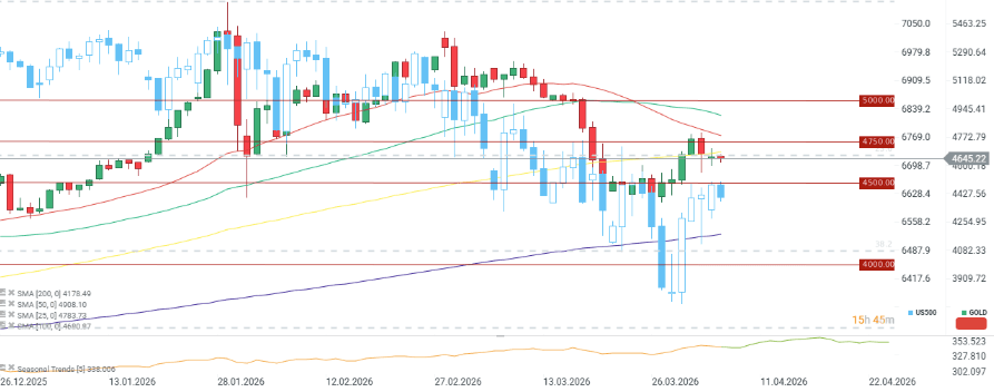 La corrección acumulada desde principios de marzo ronda el 15%, aunque en su punto más extremo la caída llegó a acercarse al 25%. La correlación entre el precio del oro y el S&P 500 ha sido elevada desde comienzos de año. No obstante, la magnitud del reciente rebote del índice estadounidense no se ha trasladado con la misma intensidad al precio del oro. Fuente: xStation5