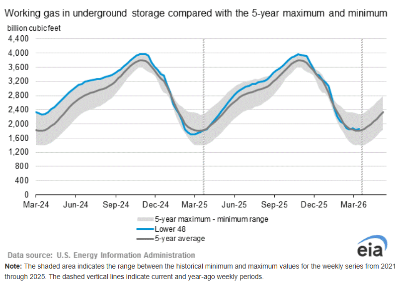 Los inventarios de gas han caído hacia la media de 5 años, pero comienzan a repuntar. En marzo se registraron dos informes que mostraron un aumento de inventarios, a pesar de que teóricamente aún estaba vigente la temporada de calefacción. Fuente: EIA