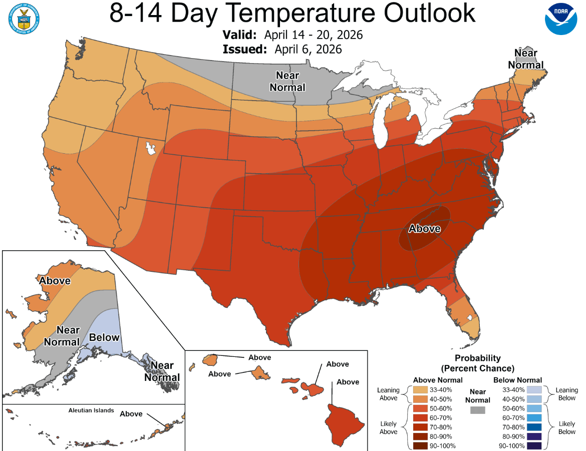 Las previsiones para las próximas dos semanas indican temperaturas superiores a lo normal, lo que implica un consumo mínimo de gas para calefacción. No obstante, las previsiones estacionales sugieren que el verano también será más cálido, lo que podría elevar la demanda futura. Fuente: NOAA