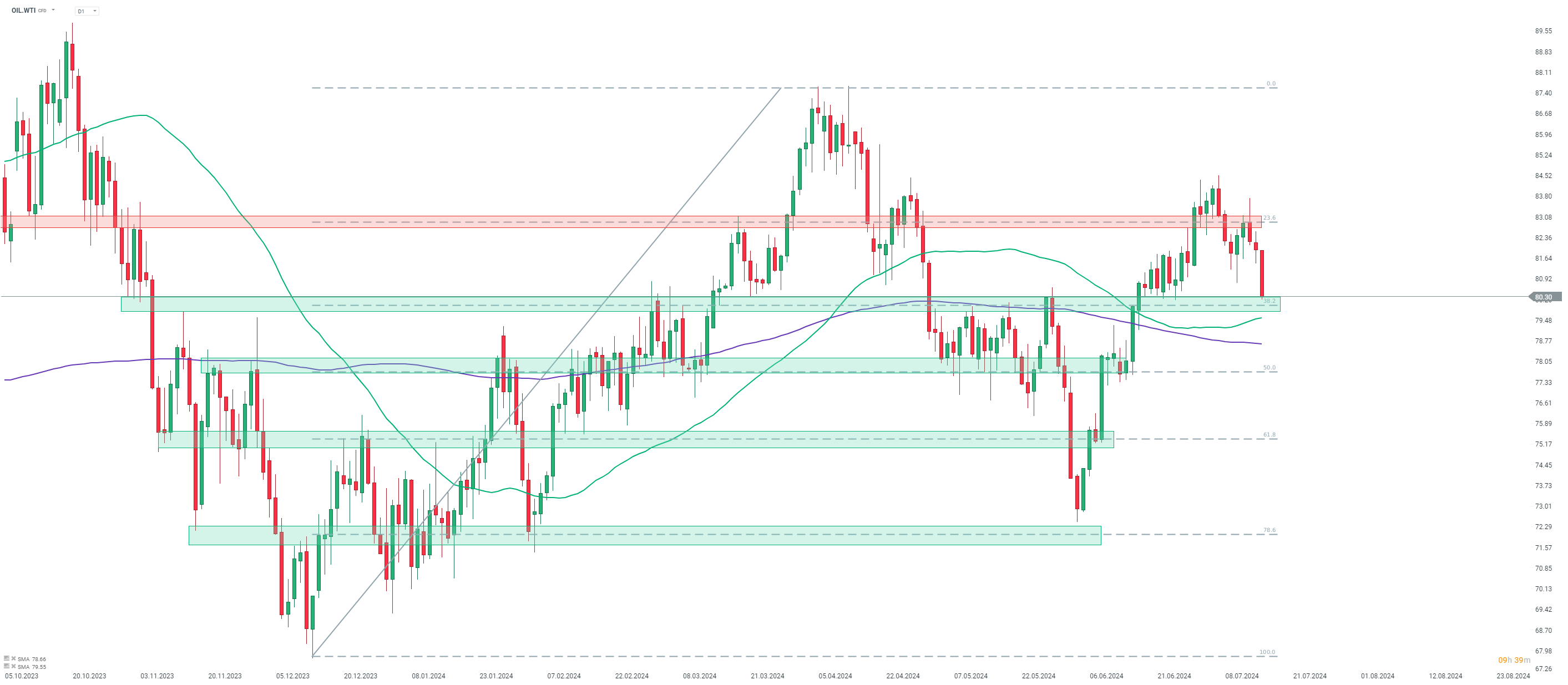 La desaceleración del crecimiento económico chino está ejerciendo presión sobre los precios del petróleo, y el WTI cayó al nivel más bajo en casi un mes. Actualmente, el precio está probando la zona de soporte marcada con un retroceso del 38,2% del movimiento alcista lanzado en diciembre de 2023. Fuente: xStation5