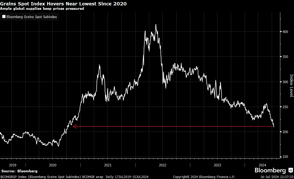 - Los mismos factores que hacen bajar los precios del trigo también se aplican a otros cereales. El índice Bloomberg Grains Spot, que también incluye maíz y soja, cayó al nivel más bajo desde 2020