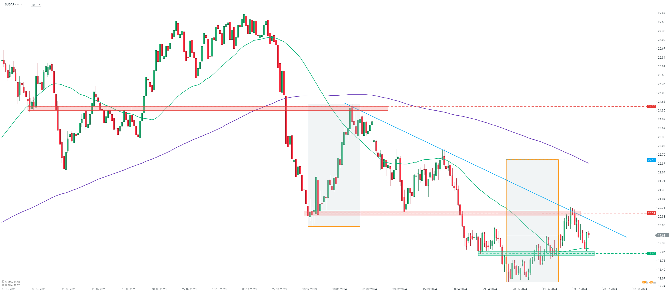 SUGAR detiene un movimiento a la baja y rebota en la media móvil de 50 sesiones. Sin embargo, las materias primas siguen en una tendencia a la baja y sería necesaria una ruptura por encima de la línea de tendencia a la baja (actualmente en el área de 20,25), así como el límite superior de la geometría del mercado en 22,50 para mejorar las perspectivas para los alcistas. Fuente: xStation5