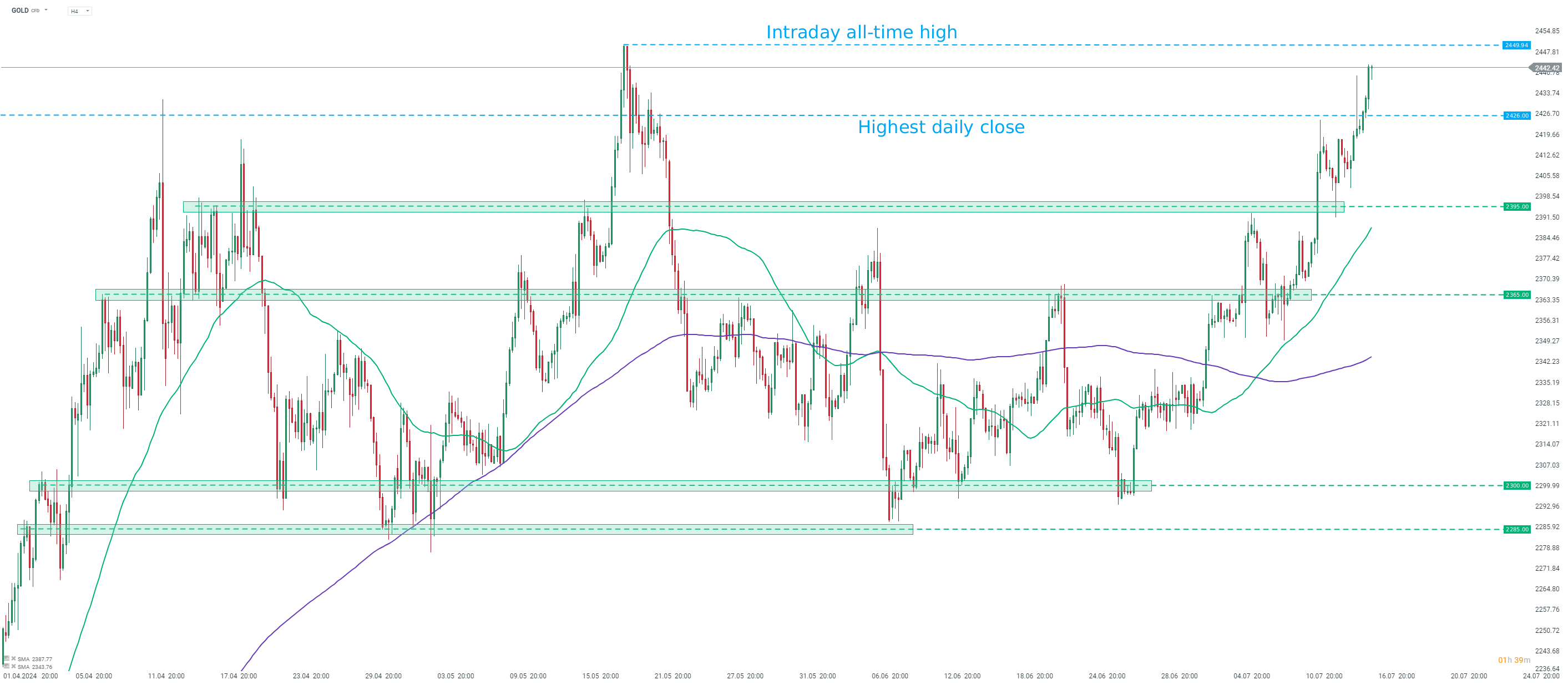El ORO se dirige al cierre diario más alto de la historia a medida que aumentan las apuestas moderadas de la Fed. Las materias primas también cotizan alrededor de un 0,4% por debajo de su máximo histórico intradiario. Fuente: xStation5