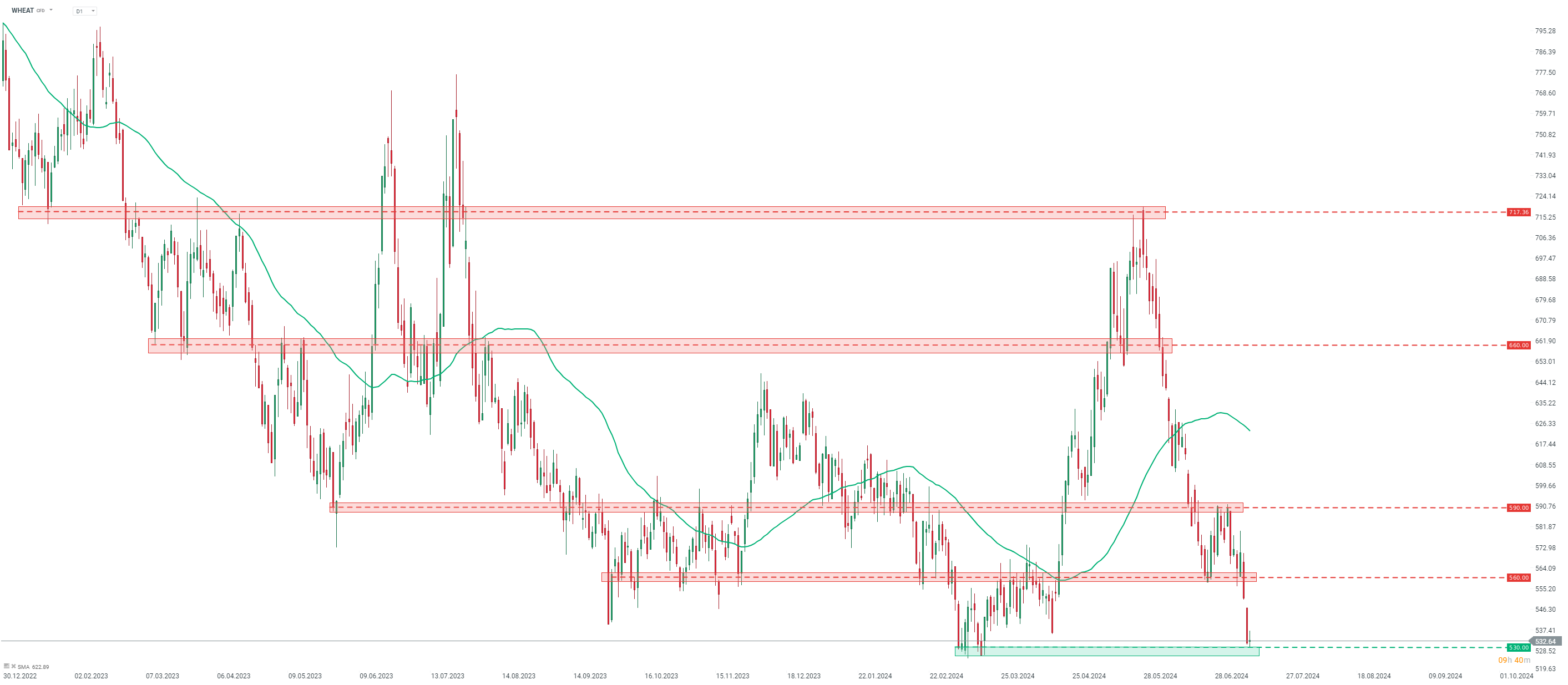 El TRIGO se desploma al nivel más bajo desde mediados de marzo de 2024 como evidencia de un amplio aumento de la oferta global. Una caída por debajo de la zona de soporte 530 llevaría el precio a niveles no vistos desde agosto de 2020. Fuente: xStation5