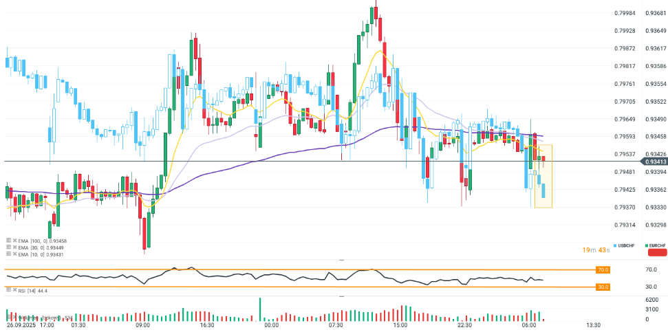 Tanto el EUR/CHF como el USD/CHF (en azul) cayeron levemente después de unos datos de ventas minoristas más débiles de lo esperado, y el descenso fue más pronunciado en el USD/CHF debido a la debilidad acumulada del dólar.
