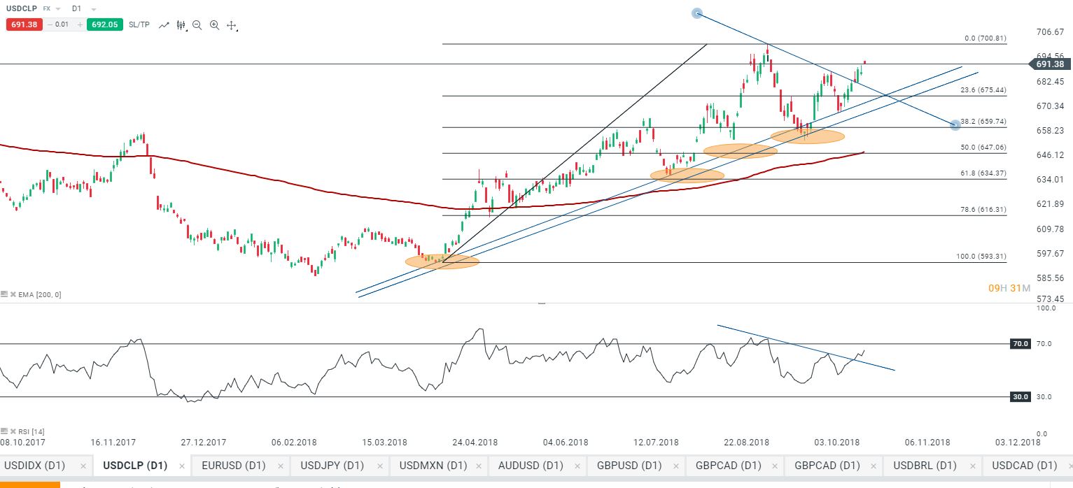Caídas en el precio del cobre y fortaleza del usd a nivel internacional, impulsarían al alza al usdclp en la sesión de hoy junto con esto tenemos que el ultimo máximo es creciente, rsi rompe la línea de tendencia bajista, si el pib de hoy supera los 3,3% podríamos ver al usdclp probablemente llegando a 700, en caso que el dato con cumpla con las prespectivas del mercado podríamos ver retrocesos hasta los 685.