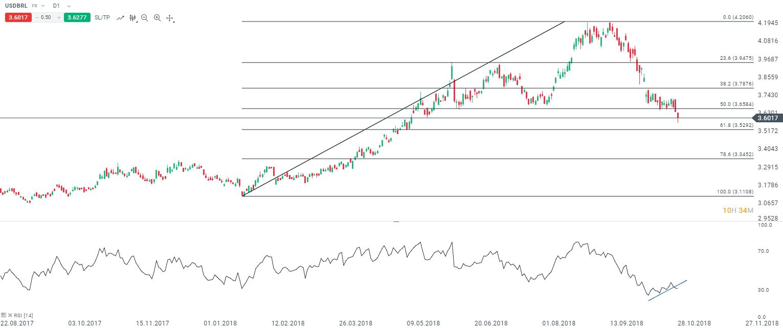 Los principales índices a nivel global cotizan al alza en la sesión de hoy, donde destacan subidas del 2% en el Dax, el Ibex 1,32%, y los futuros de EEUU también cotizan al alza, a pesar de estas subidas los principales índices aún no recuperan los niveles de soportes más importantes y los motivos de las caídas aún no se han solucionado, por lo tanto, no sería raro que durante la semana veamos nuevas caídas. Para hoy tenemos el PCE , que es el dato de gasto que está mirando de cerca la fed para las subidas de tasas, un dato sobre lo esperado podría ser negativo para los mercados. En Brasil la elección del candidato de extrema derecha Jair Bolsonaro fortalece a las monedas emergentes y el bovespa sube más de un 2% en el pre-market. Esta semana está cargada de datos macroeconómicos lo principal será el martes con el Pib de la zona Euro, donde se espera que llegue a 1,9%, el miércoles el Ipc ( Zona Euro), y el viernes tendremos el dato más importante del mes, las nóminas no agrícolas de EEUU donde el mercado espera que se generen 191.000 nuevos puestos de trabajo.
