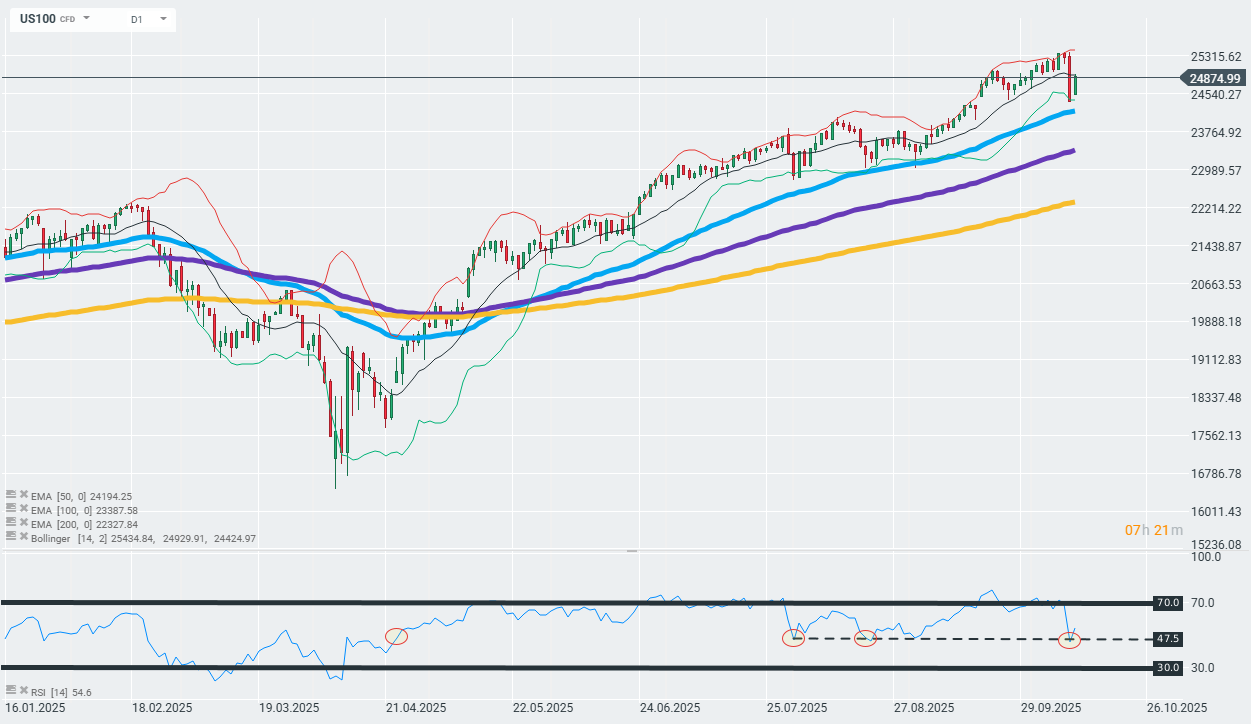 El US100 rebota tras las fuertes caídas del viernes, en medio de la creciente incertidumbre entre Estados Unidos y China. Desde una perspectiva técnica, la tendencia alcista se mantiene muy sólida. La media móvil exponencial (EMA) de 50 días, que no ha sido puesta a prueba por la presión vendedora desde principios de septiembre, podría seguir actuando como un nivel de soporte clave.