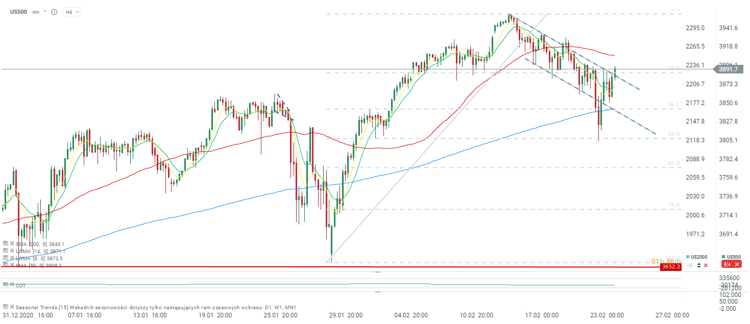 US500 rompió por encima de la resistencia clave con un retroceso del 23,6% y se acerca lentamente al área de los 3.900 pts. Además, es posible que se esté formando un patrón inverso de cabeza y hombros con la marca de inmersión de ayer en la cabeza del patrón. Fuente: xStation5