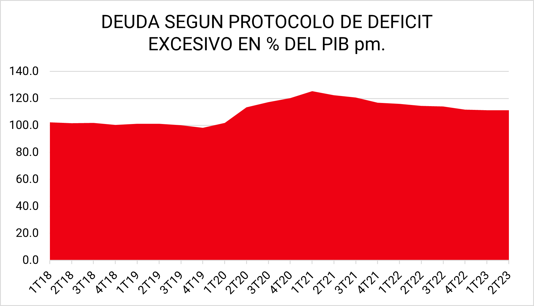 En términos absolutos la deuda ascendió a 1.569mm de euros. Es cierto que con respecto a finales de 2022 el ratio deuda/PIB ha bajado en 0,4 puntos porcentuales, pero el nivel de deuda sigue siendo preocupante y se espera que se tomen medidas con el objetivo de hacer frente a las reglas presupuestarias impuestas por la Unión Europea y que entrarán en vigor en 2024.