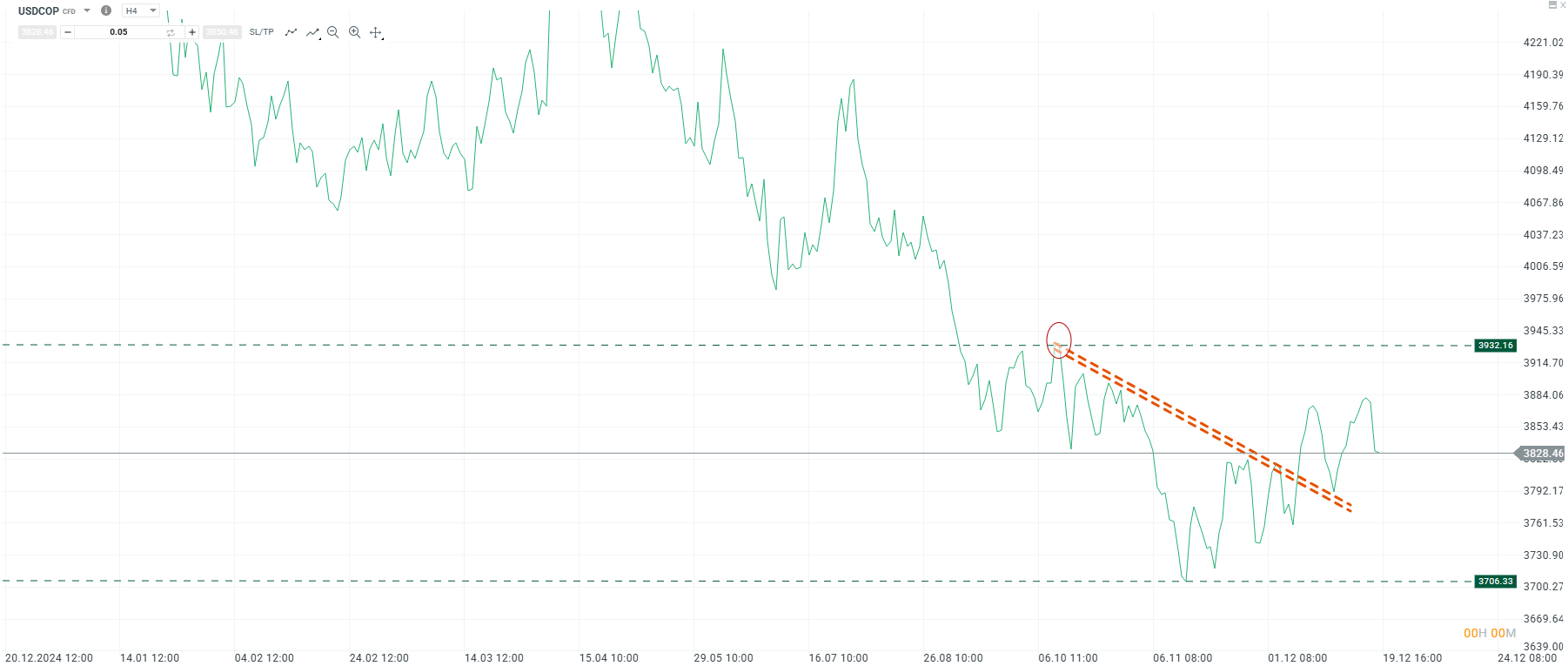 Precio del peso colombiano vuelve a posicioinarse hacia los niveles de resistencia, tras los fuertes fortalecimientos alcanzados este año, precio podria alcanzar los 3932 al final de la semana