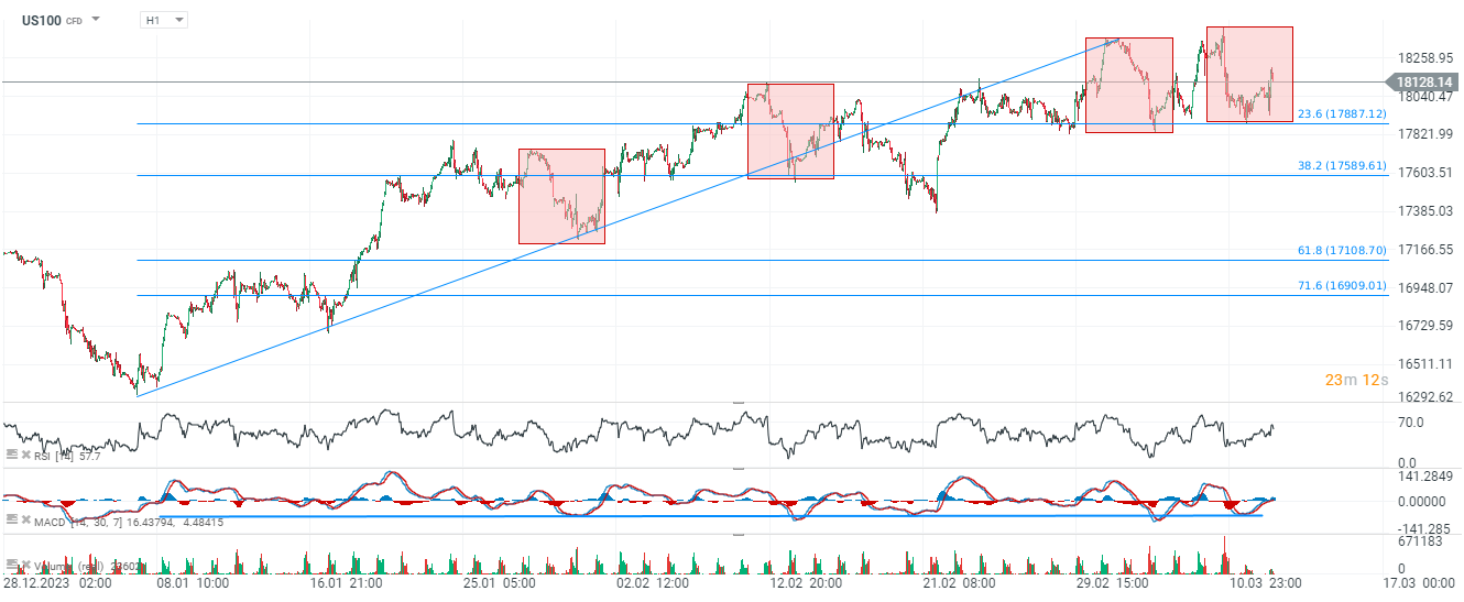 Después de una corrección de 1:1 en los futuros del Nasdaq100 (US100), los alcistas vuelven a controlar los sentimientos, ya que las empresas de inteligencia artificial ganan después de que el informe de Oracle del cuarto trimestre de 2023 y los comentarios de la empresa fueran mejores de lo esperado. El movimiento descendente se detuvo en el retroceso de Fibonacci de 23,6 de la onda ascendente de enero. A continuación, la zona de resistencia crítica es 18.300, pero no es seguro que este nivel se ponga a prueba antes del crucial vuelco de esta semana.