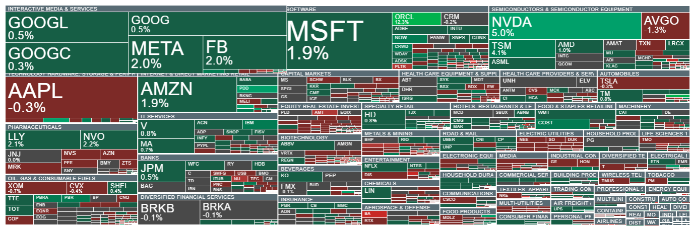 Las acciones de Oracle de Larry Page (ORCL.US) están ganando un 12% después de que la compañía de software informara de un aumento sorprendentemente fuerte en las reservas de grandes clientes para su unidad de negocio de computación en la nube. Wall Street ahora espera que la compañía eventualmente pueda aumentar su participación de mercado, y una mayor demanda de sus servicios impulsada por la IA se suma al sentimiento positivo. La compañía superó las expectativas en cuanto a ingresos y ganancias por acción, y sus acciones están alcanzando hoy máximos históricos después de una corrección temporal. Junto con Oracle, el sector de semiconductores y las acciones de BigTech están ganando.