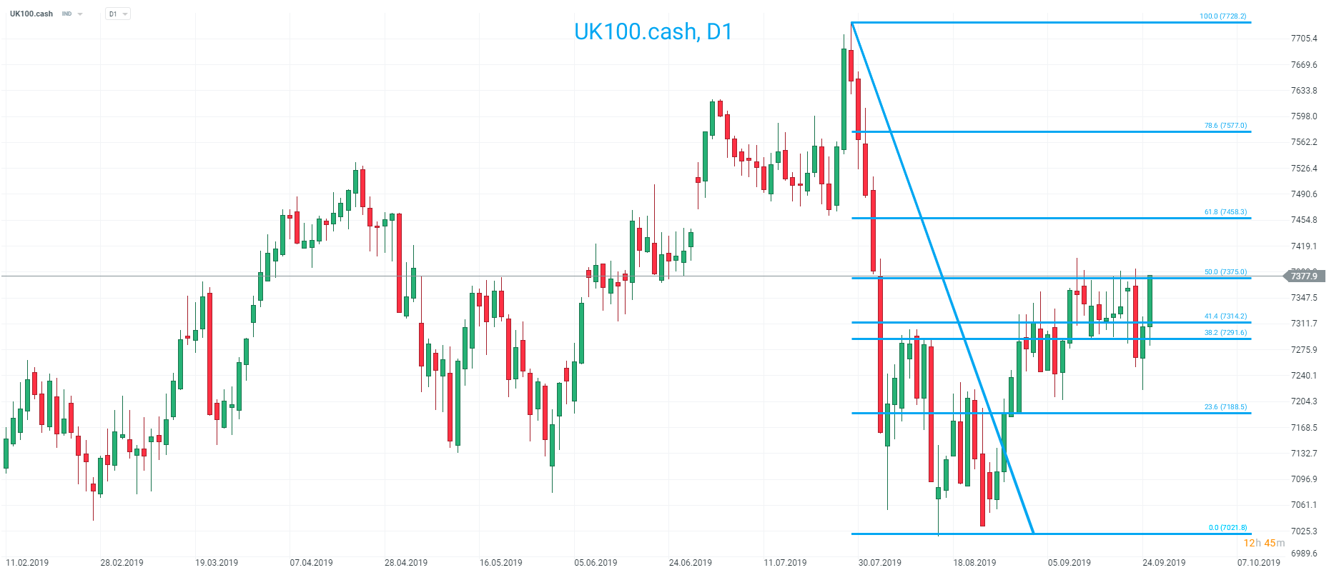 El principal índice de referencia de acciones del Reino Unido ha ganado en las últimas dos sesiones, ya que la libra ha caído con el precio una vez más probando la zona de resistencia alrededor de 7375-7400 que también coincide con el retroceso del 50% de Fib de los grandes descensos observados durante el verano. Fuente: xStation