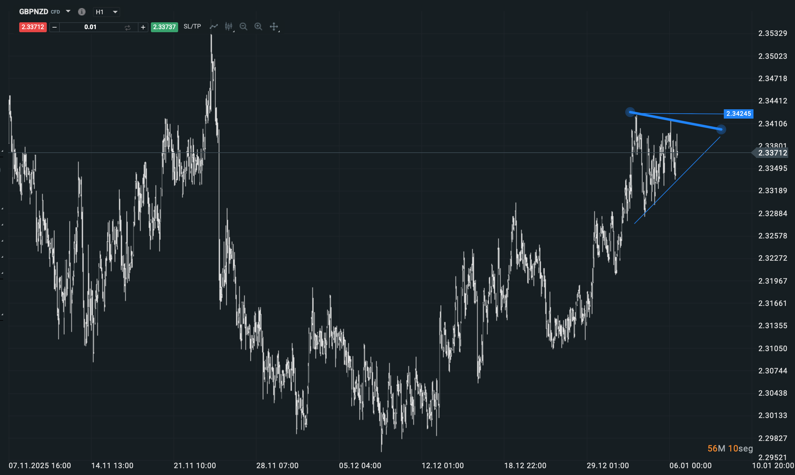 Otro cruce interesante desde el punto de vista técnico es el GBPNZD. Aquí no hay aceleración vertical, sino algo mucho más sano para el trading: una figura triangular en gráfico de 4 horas, con máximos descendentes cada vez menos agresivos y mínimos que empiezan a sostenerse. Este tipo de estructura suele anticipar continuación cuando el mercado decide dirección, y de momento el sesgo sigue favoreciendo a la libra mientras no se rompa la base de la figura.