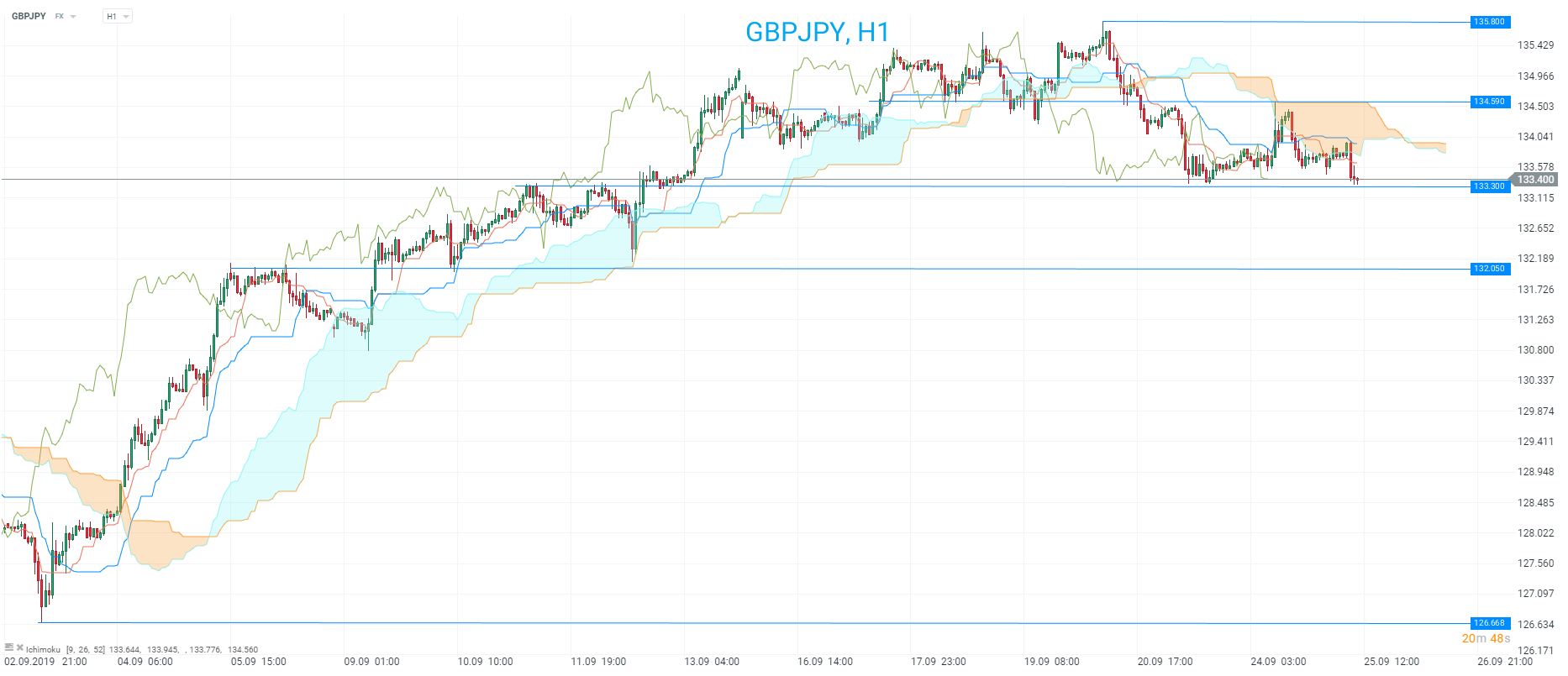 GBPJPY ha retrocedido al nivel de soporte anterior alrededor de 133.30. El precio vuelve a estar debajo de la nube en H1. Fuente: xStation