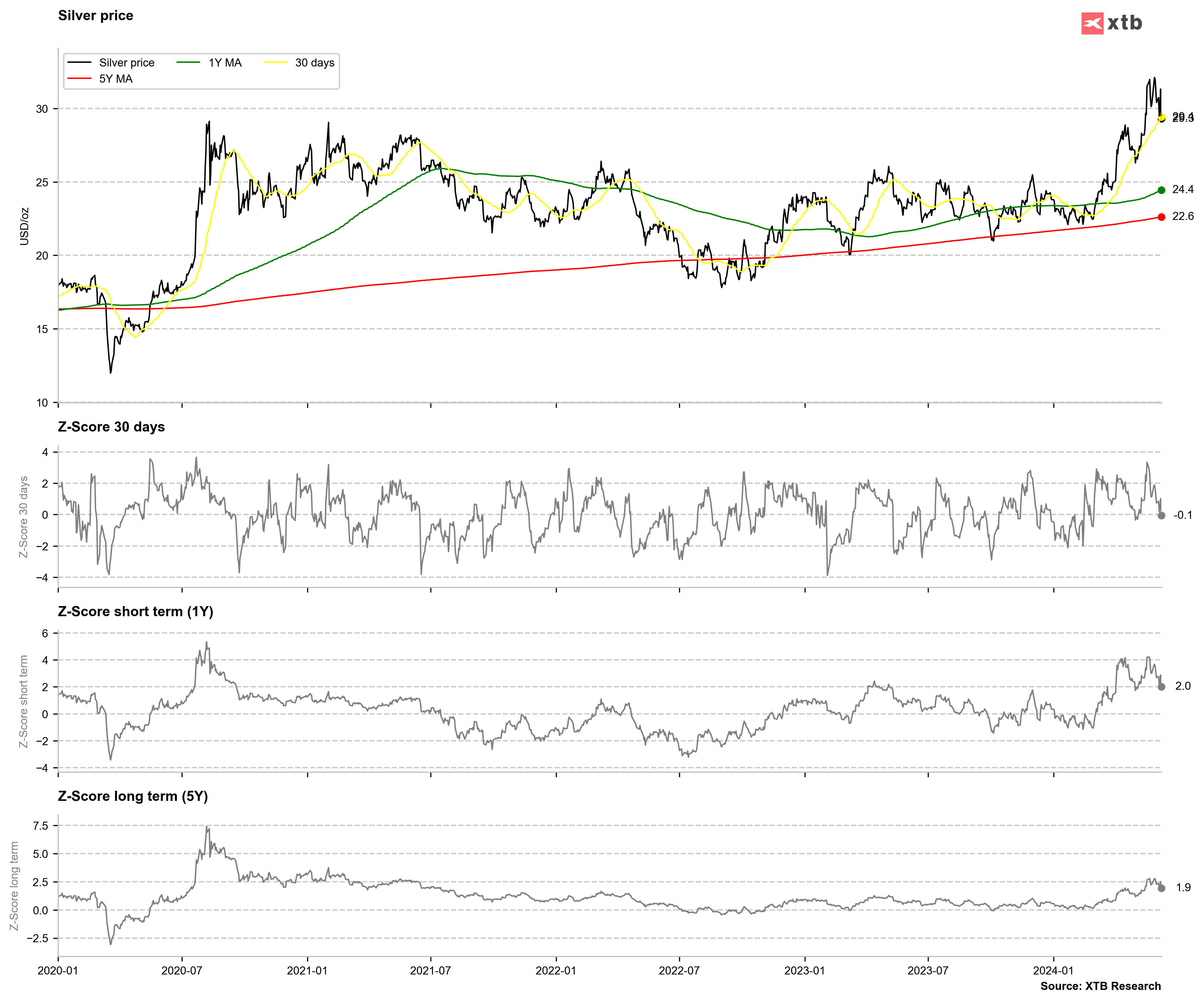La desviación con respecto al promedio de un año sigue siendo significativa. Mientras tanto, la plata ya ha superado el promedio de 30 días; por lo general, observamos nuevas caídas seguidas de una desviación doble del promedio de 30 días antes de que se produzca un rebote. Por otro lado, esto suele ocurrir durante tendencias laterales. Fuente: Bloomberg Finance LP, XTB