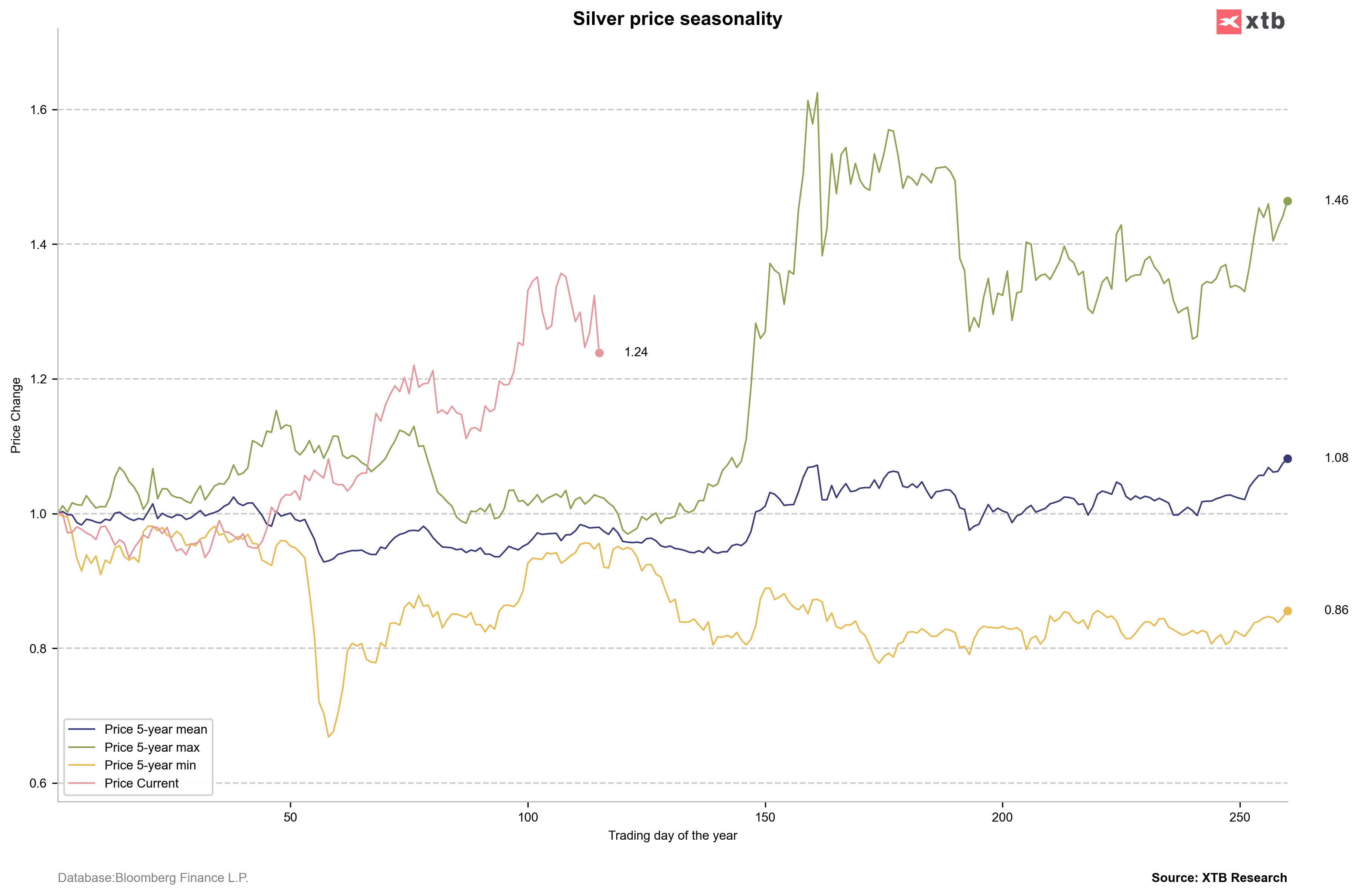 La plata ha experimentado sus mayores alzas en 5 años. La estacionalidad no es muy evidente, pero teóricamente indica actualmente una tendencia lateral o ligeras caídas, y sólo alrededor de la 150ª sesión del año deberíamos esperar una recuperación más significativa. Esto podría suceder cuando se vuelva a hablar de recortes de tipos en Estados Unidos. Fuente: Bloomberg Finance LP, XTB