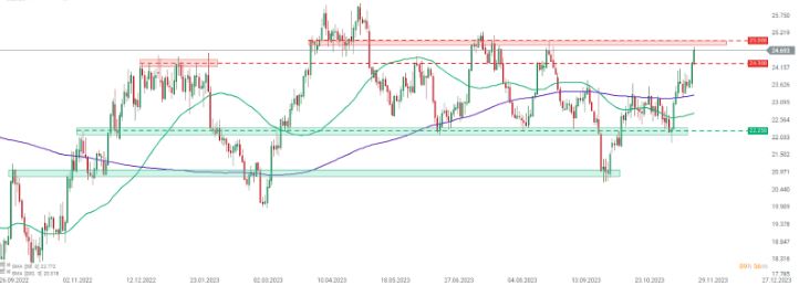 El dólar estadounidense inició esta nueva semana con el pie izquierdo y está cayendo frente a todas las demás monedas del G10. La moneda estadounidense se está debilitando a medida que los operadores consideran que el ciclo de subidas de tipos de la Fed ha terminado y se preparan para recortes de tipos en 2024. Las expectativas moderadas y la debilidad del dólar están proporcionando combustible para el repunte de los metales preciosos. El oro sube un 0,6% más en el día y cotiza por encima de la marca de 2.000 dólares. El oro está cerca de cerrar el primer mes en la historia por encima de este nivel psicológico. Mientras tanto, la plata sube hoy un 1,7% y se acerca lentamente a la zona de los 25 dólares por onza por primera vez desde finales de agosto de 2023.