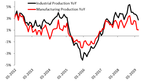 La producción industrial de los EE. UU. confirmó una desaceleración de la economía al contraerse en marzo en un 0,1% intermensual después de un aumento del 0,1% en febrero y por debajo del aumento esperado del 0,2%. Esto también significa que la producción se contrajo bastante en el primer trimestre ya que febrero fue el único mes de aumento. Como resultado, el crecimiento de la producción anual se encuentra en el mínimo de 18 meses en el 2.8%. El crecimiento de la manufactura es aún más débil al 1% a/a (más débil en más de 2 años) y mientras que los efectos de base pueden ayudar a que el crecimiento de y/y se recupere en el segundo trimestre, la segunda mitad de este año podría ver que la producción manufacturera en realidad se contraiga .