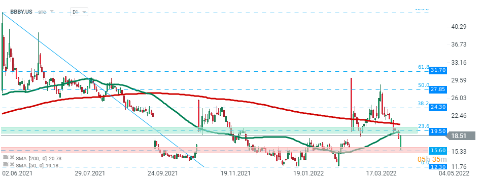 El precio de las acciones de Bed Bath & Beyond (BBBY.US) comenzo la sesión de hoy fuertemente a la baja, sin embargo, los compradores lograron recuperar el control a pesar del sentimiento negativo. El precio rebotó en el soporte local en $ 15,60 y se acerca a una resistencia importante en $ 19,50, que está marcada con un retroceso de Fibonacci del 23,6% de la última corrección. Fuente: xStation5
