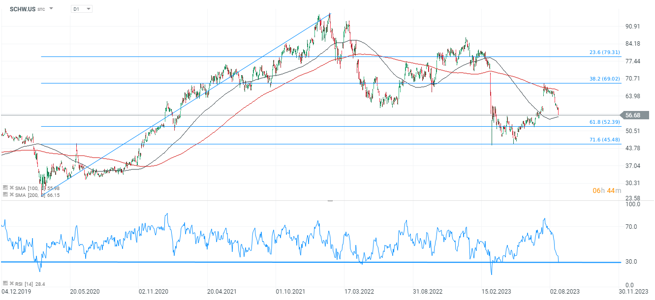 Si observamos el precio de la acción, vemos que la acción respetó la resistencia en el SMA200 (línea roja) y no logró superarla. Como resultado, las acciones de Charles Schwab ahora están probando los niveles de $56, donde se ejecuta el SMA100, pero no se descarta una nueva caída, hasta $52,3, donde se encuentra el retroceso de Fibonacci de 61,8 de la onda ascendente de 2020.