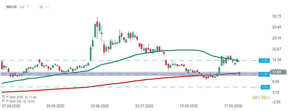 Las acciones de Inovio Pharmaceuticals (INO.US) iniciaron la sesión de hoy con una brecha de precios bajista y actualmente están probando una resistencia importante a $ 11.00 por acción, que se ve reforzada adicionalmente por 200 MA (línea roja). Si los vendedores logran romper por debajo de él, podría iniciarse un impulso a la baja hacia $ 6.03. Por otro lado, si los compradores recuperen el control, la resistencia de $ 16,53 por acción puede estar en riesgo. Fuente: xStation5