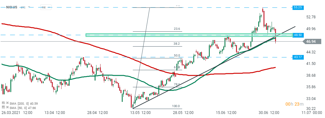 Las acciones de NIO (NIO.US) cayeron bruscamente durante la sesión de hoy y rompieron por debajo de la zona de soporte principal alrededor de $ 48.50, que coincide con una línea de tendencia alcista y 50 SMA (línea verde). Si prevalece el sentimiento actual, el soporte de 43,17 dólares puede estar en riesgo. Fuente: xStation5